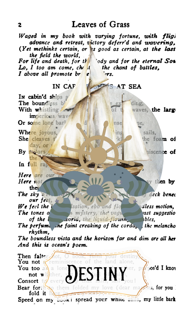 Card art designed entirely by me using public domain pages from Leaves of Grass paired with Victorian-era illustrations and digital design elements